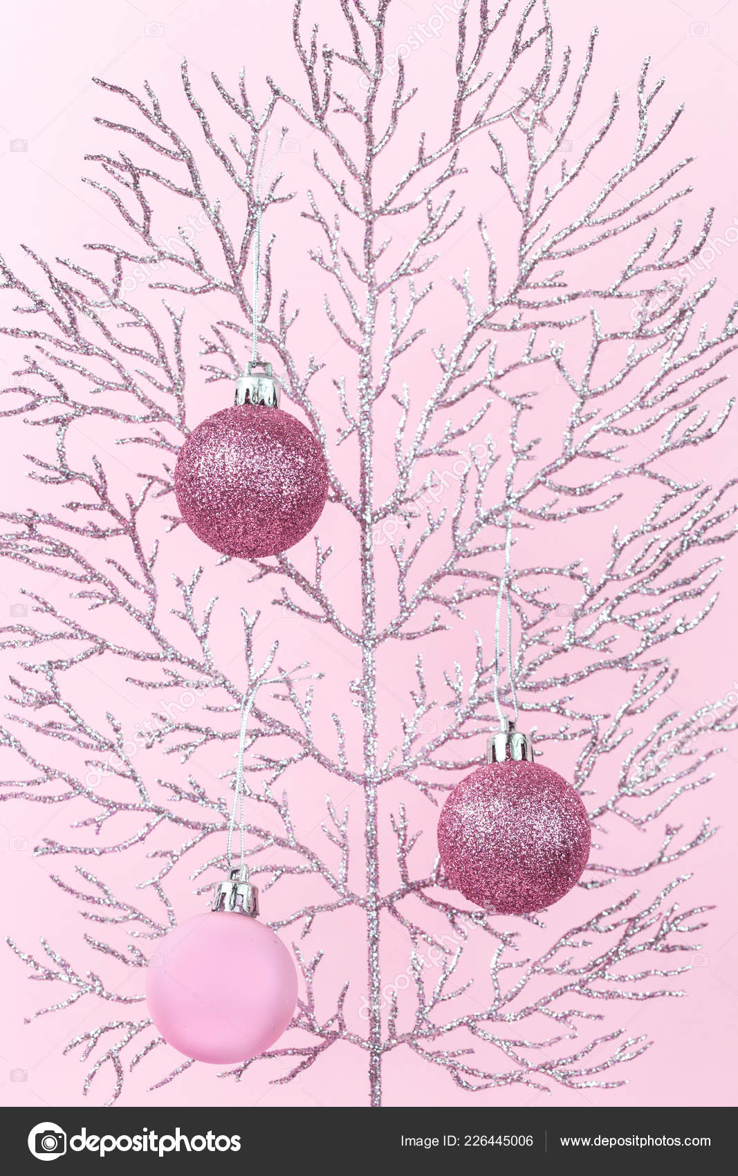 Shiny Pastel Pink Christmas Decorations Silver Branch Pink Background Monochrome Stock Photo C Taniascamera 226445006